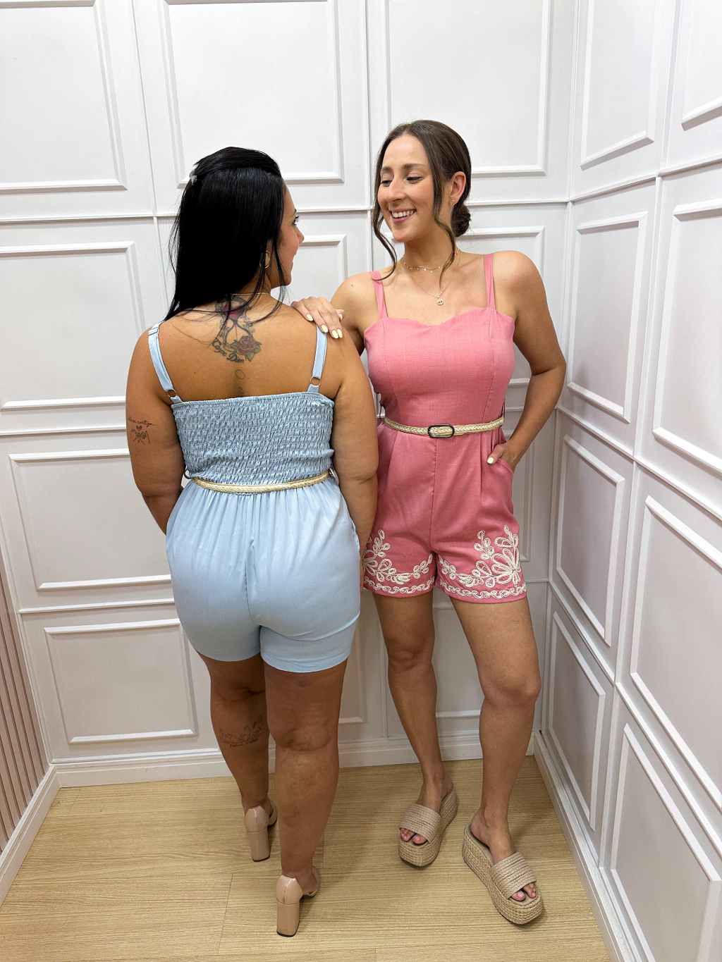 Seu decote reto e alças finas proporcionam um visual leve e feminino, enquanto o acabamento bordado nos shorts adiciona um charme exclusivo e refinado. Confeccionado em tecido leve, o Macaquinho Monique é perfeito para compor looks frescos e estilosos com um toque de requinte.