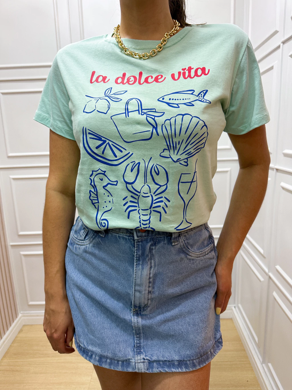 Confeccionada com modelagem confortável, gola redonda e mangas curtas, esta camiseta é ideal para quem busca um look casual com estilo e elegância. O caimento perfeito valoriza sua silhueta, proporcionando liberdade de movimento sem abrir mão da sofisticação.